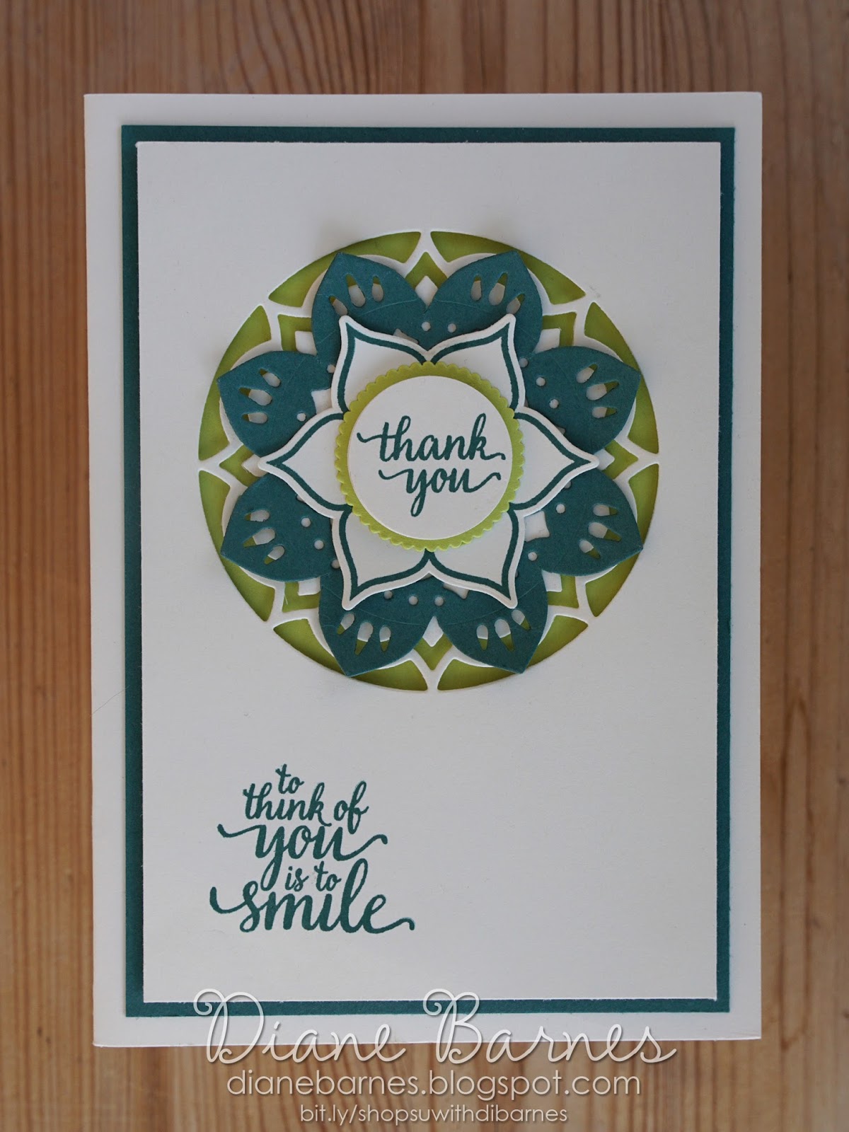 I cut the tranquil tide flower medallion from the tranquil tide layer, & the lemon lime twist scallop circle from the square of lemon lime card behind the medallion window.